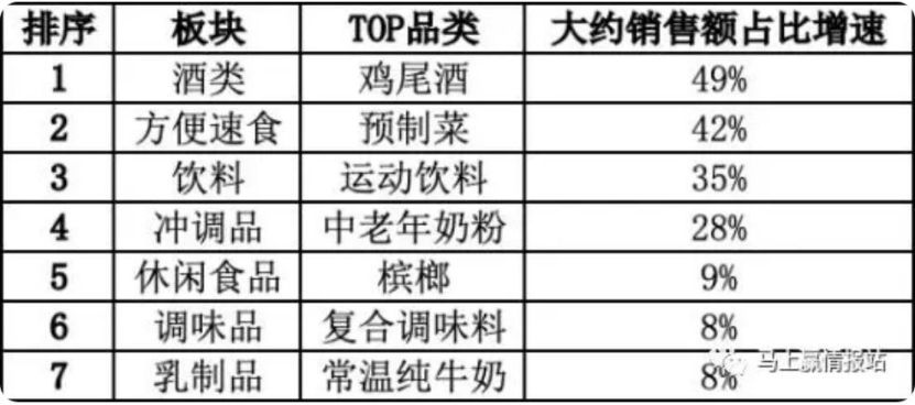 当对食品大类进行逐类目分析后,细分赛道的增长**浮出水面。在酒类、方便速食、饮料、冲调品、休闲食品、调味品、乳制品七大子类,增速最快的品类分别是鸡尾酒、预制菜、运动饮料、中老年奶粉、槟榔、复合调味料与常温纯牛奶。其中鸡尾酒、预制菜和运动饮料均以超35%增速远超其它品类。